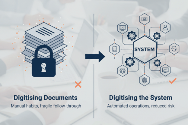 This is the point where many organisations confuse digitisation with improvement. They have digitised information, but they have not digitised management. The organisation is still relying on the same manual habits, the same informal decision-making, and the same fragile follow-through. The only difference is that the evidence now sits in a platform instead of a shared drive.